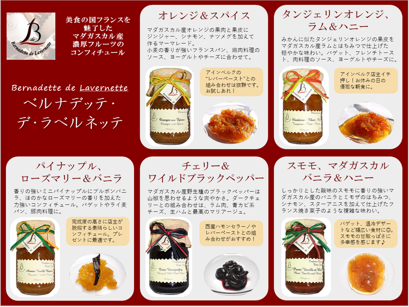 フランスからマダガスカル島に移住したブリジット・ビヤーディ女史が、フランス貴族「デ・ラベルネッテ家」伝承のレシピを用い、マダガスカル産のフルーツやスパイスを組み合わせて作る珠玉のコンフィチュールです。